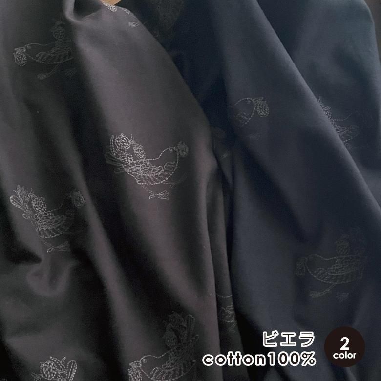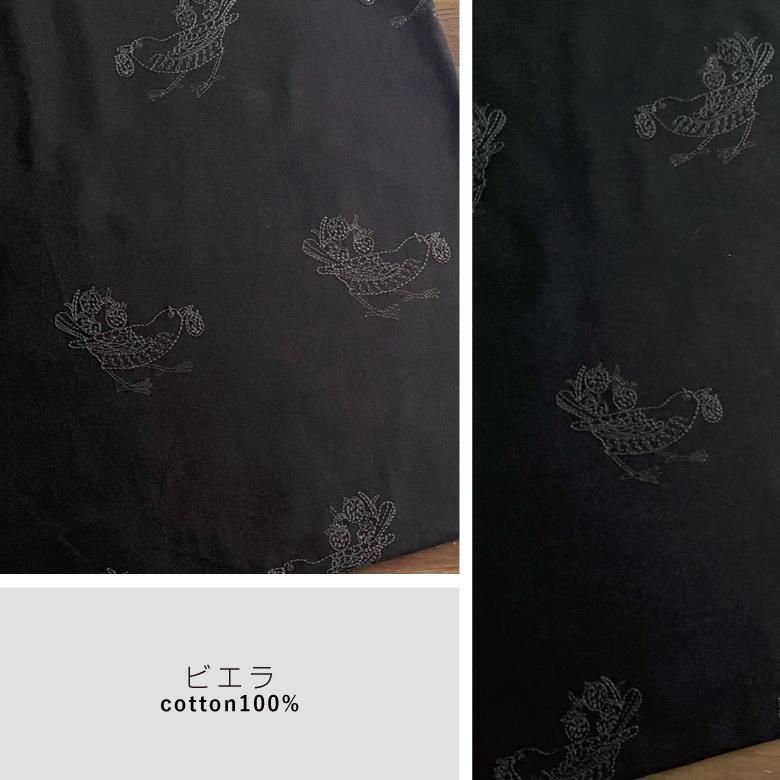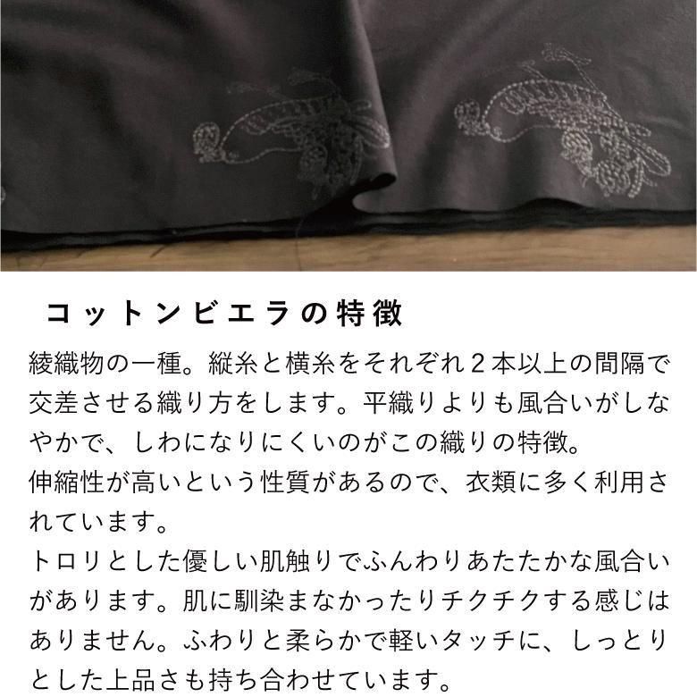 マットで上質なコットンビエラに、モチーフ刺繍をあしらいました。 同系色の刺繍が控えめに浮かび上がり、 落ち着いたトーンが上品な印象に仕上げてくれます。