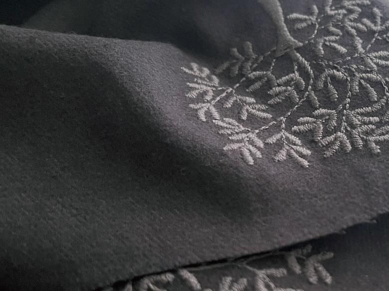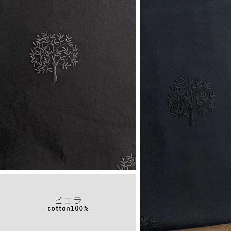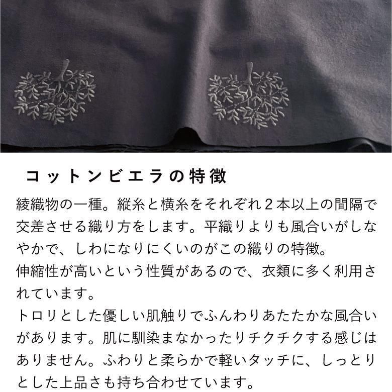 マットで上質なコットンビエラに、モチーフ刺繍をあしらいました。 同系色の刺繍が控えめに浮かび上がり、 落ち着いたトーンが上品な印象に仕上げてくれます。