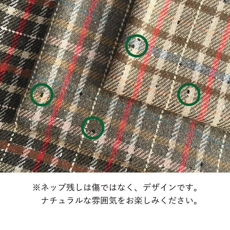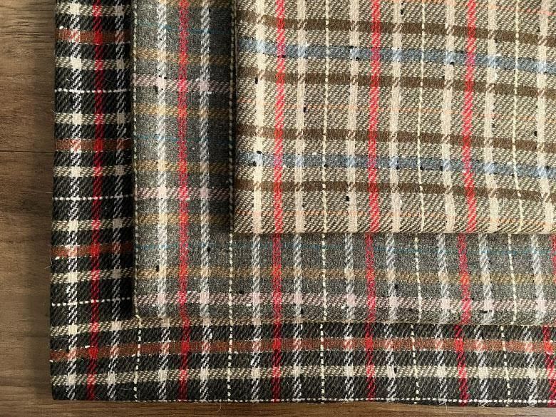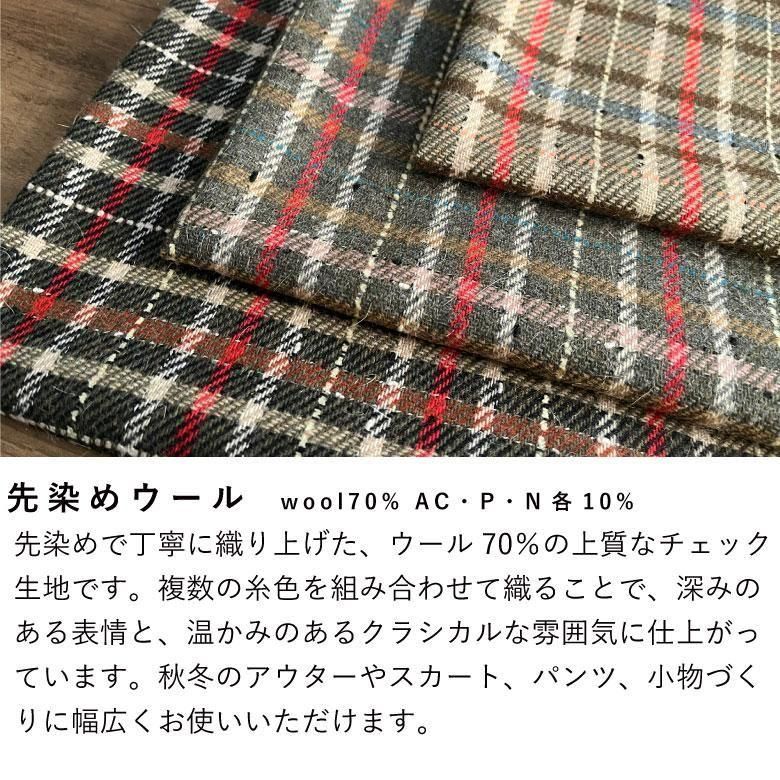 先染めで丁寧に織り上げた、ウール70%の上質なチェック生地です。複数の糸色を組み合わせて織ることで、深みのある表情と、温かみのあるクラシカルな雰囲気に仕上がっ ています。秋冬のアウターやスカート、パンツ、小物づくりに幅広くお使いいただけます。